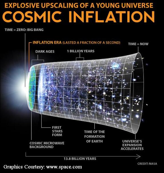 (iv) INFLATION! - this is where Guth proved himself to be an Einstein-class genius! - a small area of the nascent universe suddenly expanded exponentially! In other words, that small area of the nascent universe was simply magnified trillions of trillions of times (1026 times, to be precise) from its initial size within a billionth of a trillionth of a trillionth of a second. The rest of the nascent universe that didn't inflate merged in with the inflated universe as a relatively inferior and insignificant portion.